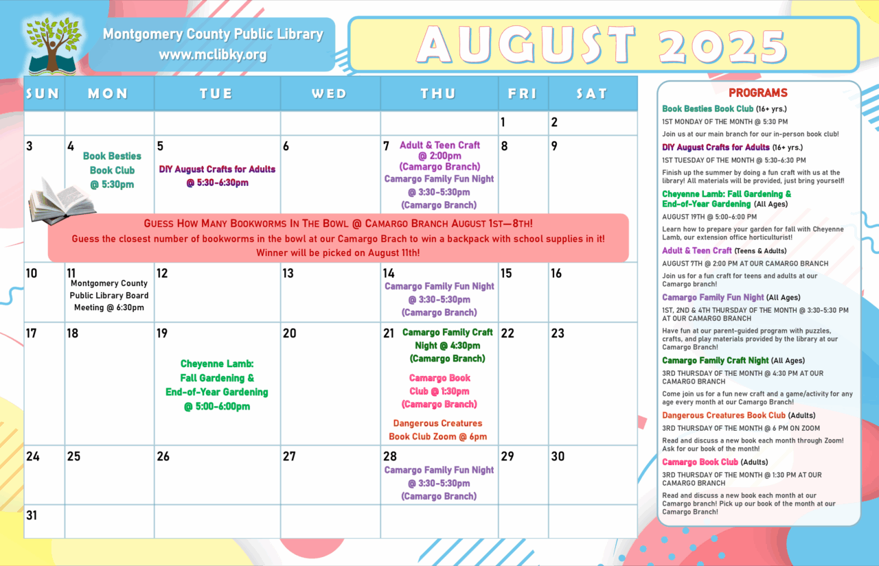 We had a great time at our programs through summer reading, and are gearing back up for normal programming starting in September! In the meantime, check out our offerings for August.