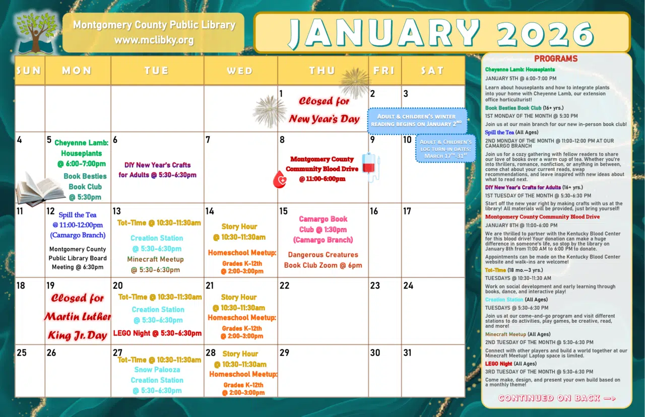 2026 is almost here, and that means a new year of programming at the library! Take a look at our program calendars for January / February and check out some of our program offerings coming up: