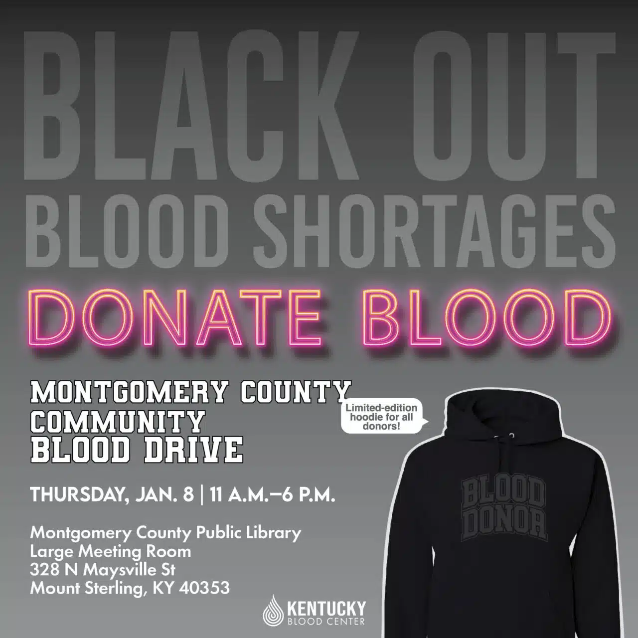 We are thrilled to partner with the Kentucky Blood Center to host another blood drive next month to kick off 2026! Donors will receive a limited-edition black “Blood Donor” hoodie for donating and helping to black out blood shortages. Join us in supporting those in our community who need blood! Your donation can make a huge difference in someone’s life- stop by the library on January 8th from 11:00 AM to 6:00 PM to donate.
