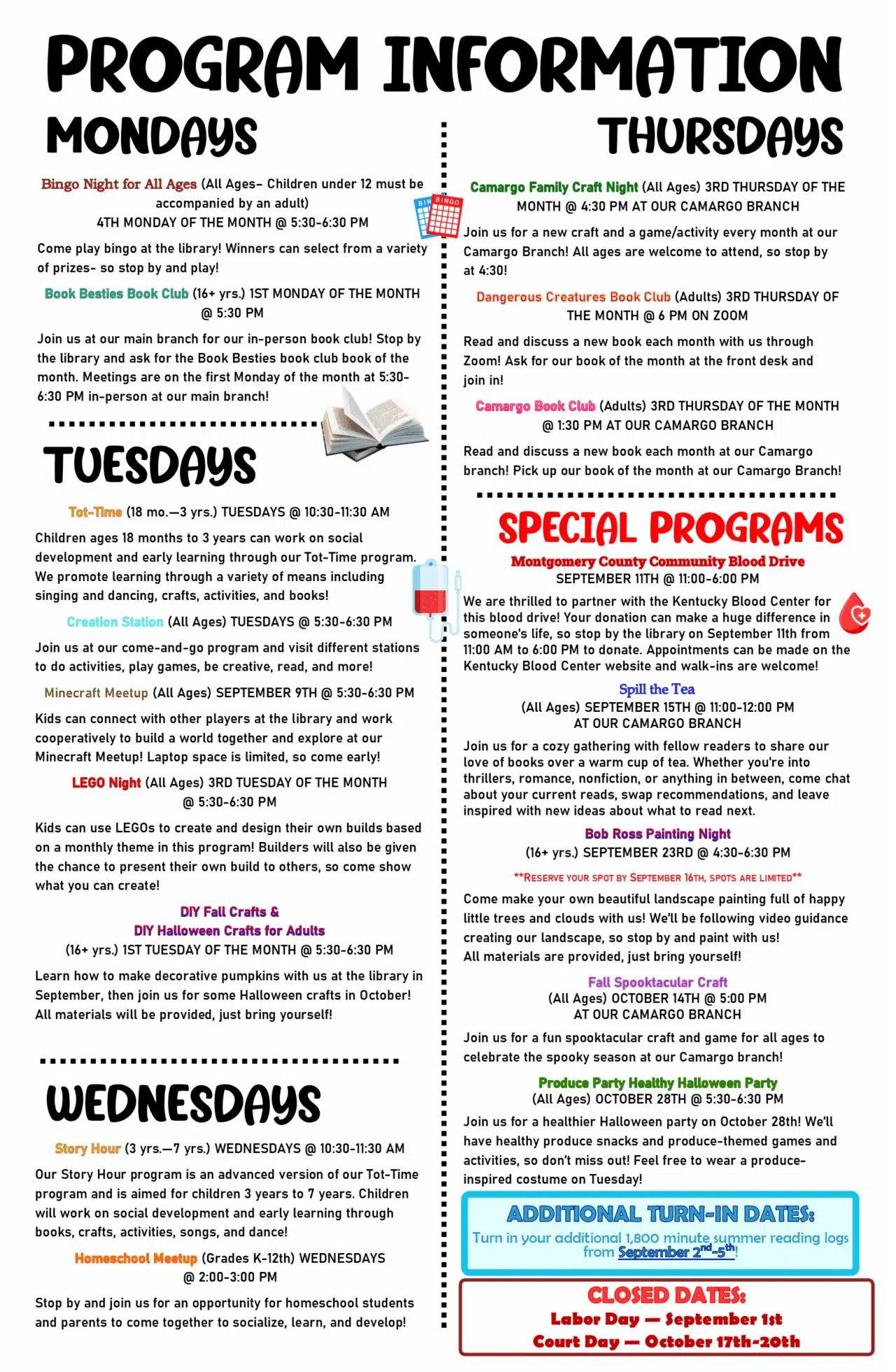 - Share your love of books over a warm cup of tea at our Spill the Tea program at our Camargo branch on September 15th! Come chat about your current reads, swap recommendations, and leave inspired about new ideas about what to read next.